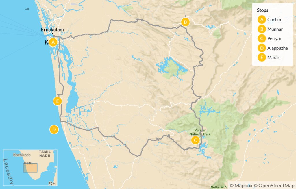 Map of Experience Kerala: India’s Backroads & Backwaters – 9 Days