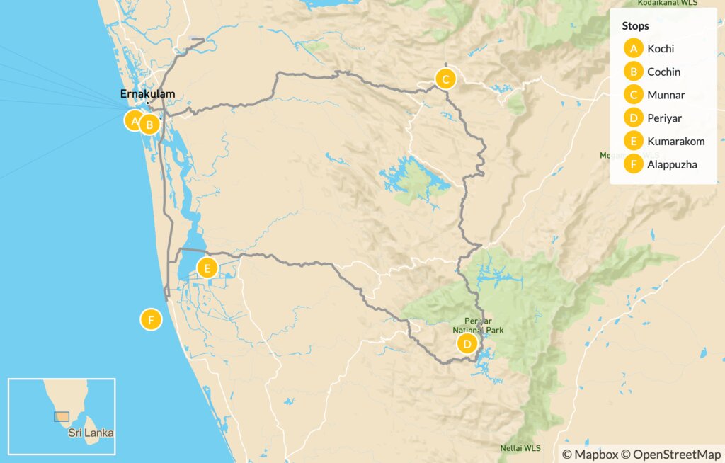 Map of Experience Kerala: Southern India’s Backwaters, Tea Fields & Wildlife – 7 Days