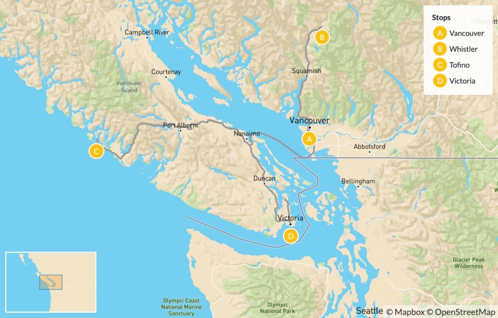 Map of Explore British Columbia’s Nature: Whistler, Ucluelet & Victoria – 7 Days