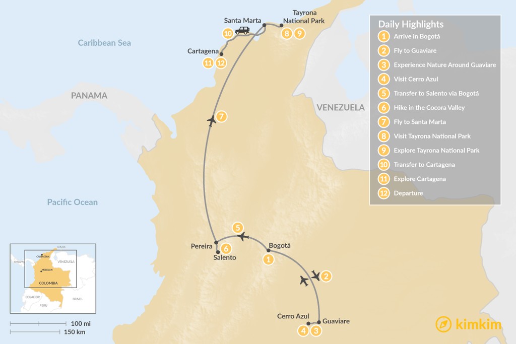 Map of Explore Colombia’s Amazon, Andes, and Caribbean Coast – 12 Days