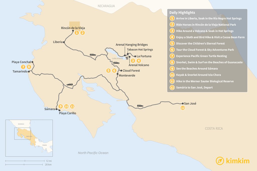 Map of Explore Costa Rica’s Volcanoes & Pacific Coast – 12 Days