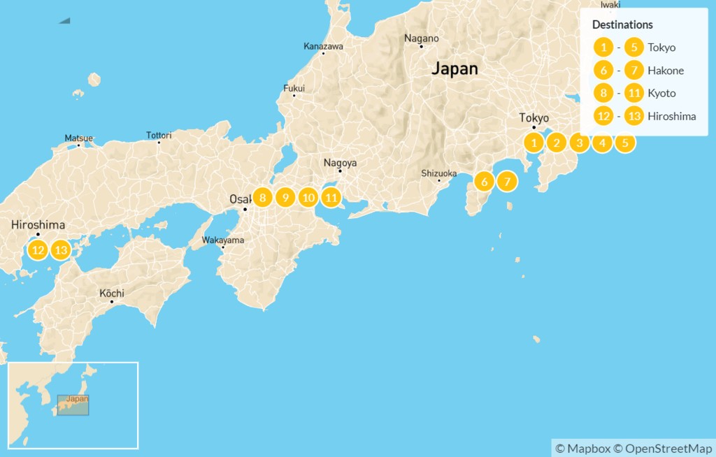 Map of Explore Japan: Tokyo, Kyoto, & Hiroshima – 14 Days