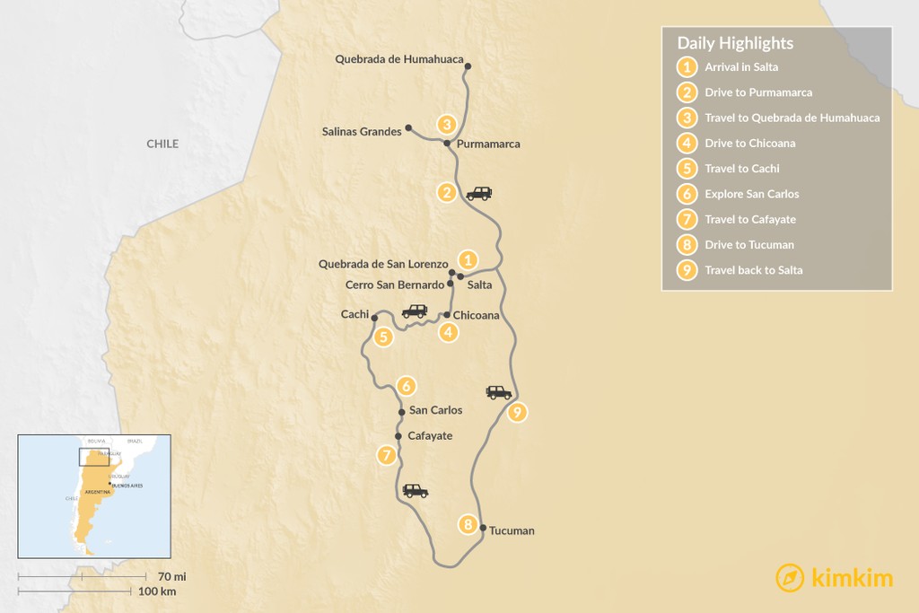 Heading North on Route 68, make your way back to Salta. Use your last day to check out the Archaeological Museum or the Artisanal Market for last minute poncho and maté souvenirs. Be sure to have one more empanada feast, and maybe catch a taxi up to Cerro San Bernardo to watch the sunset alongside the locals.