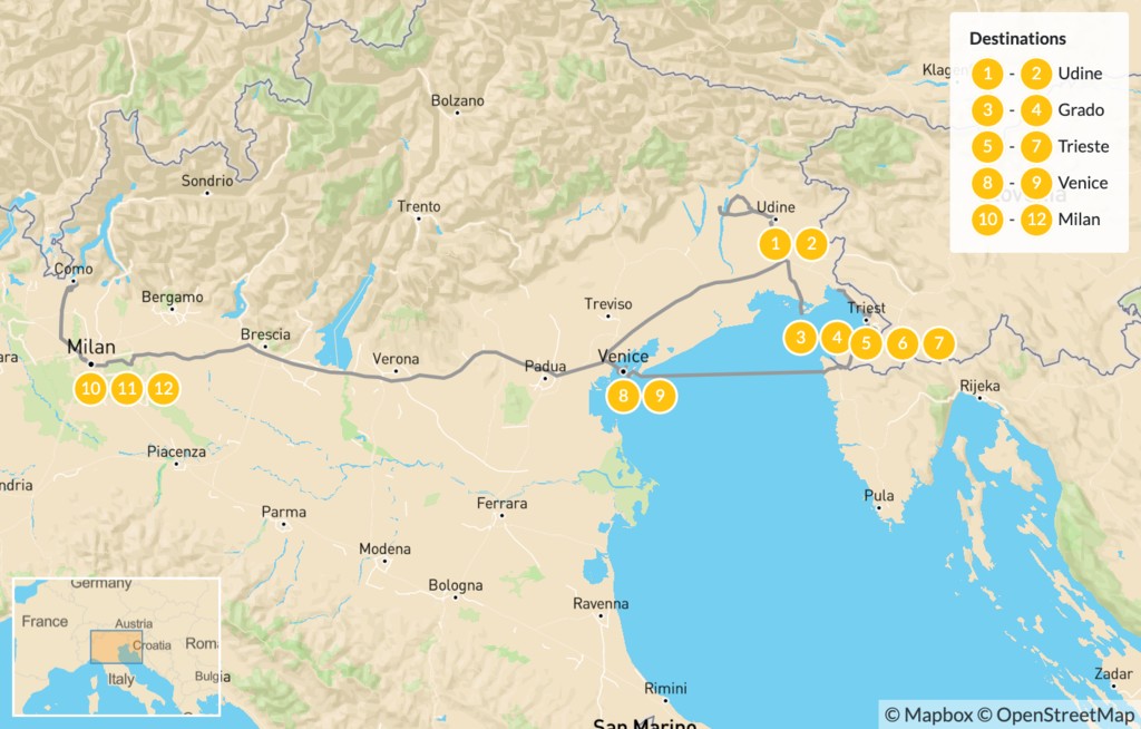 Map of Explore Northern Italy: Trieste, Venice, Milan, & More – 13 Days
