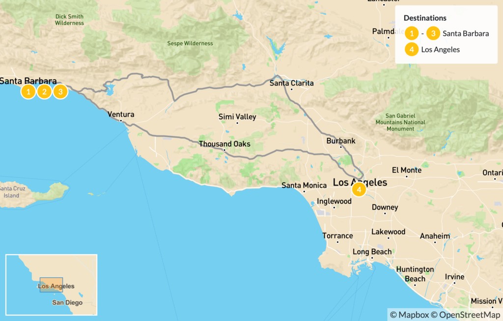 | Day 4 | Santa Barbara to Los Angeles, Stop in Ojai | Los Angeles |