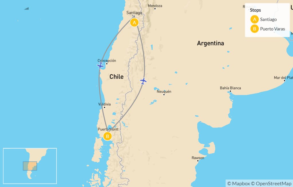 Map of Explore Santiago & the Chilean Lake District – 10 Days