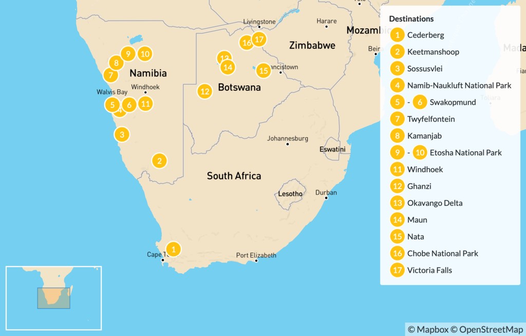 Map of Explore Southern Africa: Cape Town to Victoria Falls – 20 Days