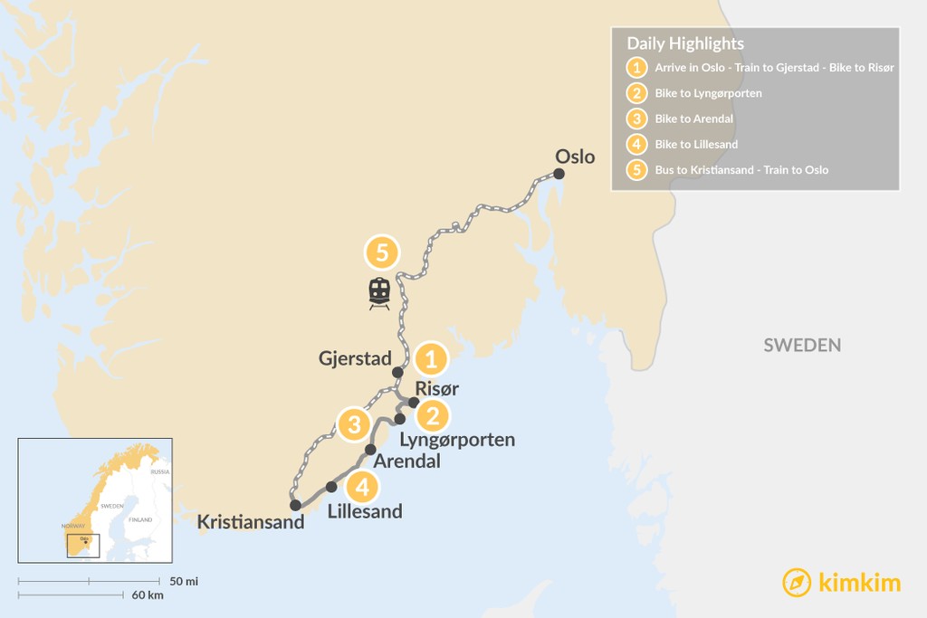 Map of Explore Southern Norway by Bicycle – 5 Days