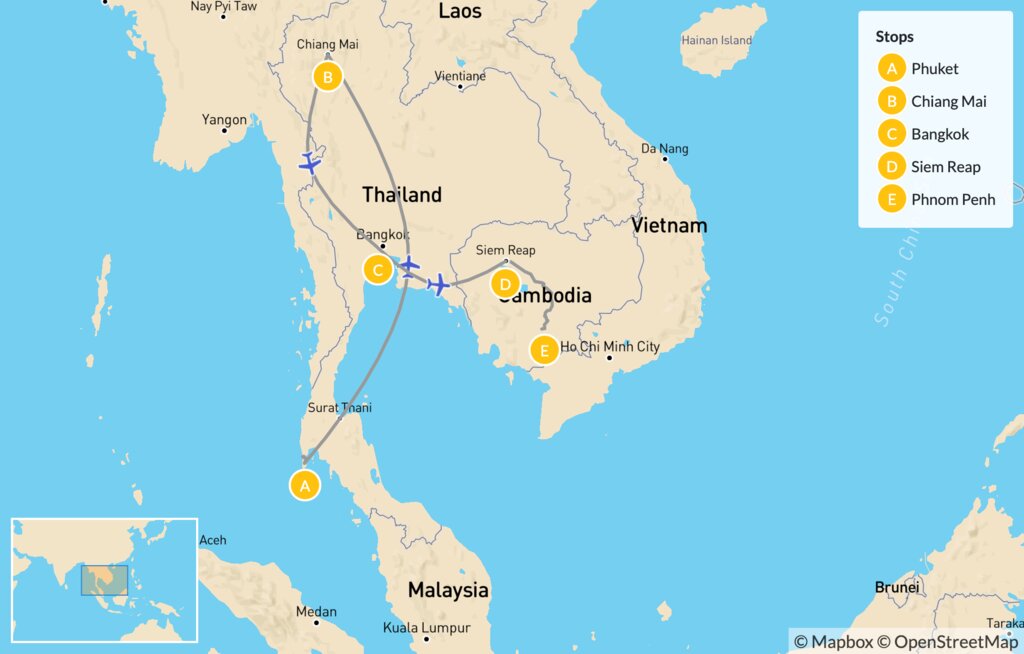 Map of Explore Thailand & Cambodia: Phuket, Chiang Mai, Bangkok, Siem Reap & Phnom Penh – 14 Days