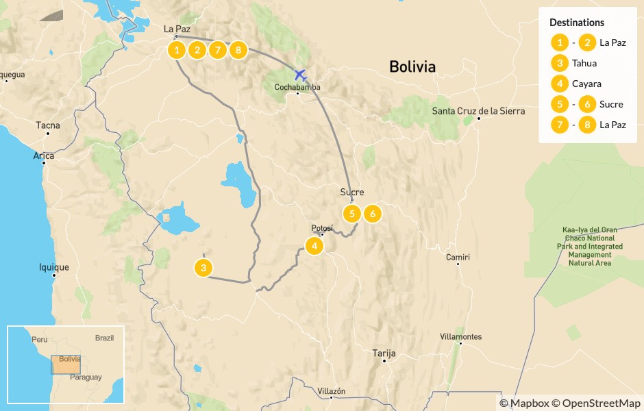 This nine-day itinerary balances excursions into the remote highlands with multiple days of activities in Bolivia’s most exciting cities. Begin in the modern, high-altitude city of La Paz before taking a private car to the northern shore of the Uyuni Salt Flats, where you will hike the Tunupa Volcano and learn about indigenous Andean cultures. After exploring the flats, you will continue on to Sucre to tour its colonial-era streets, visit its impressive museums, and learn about Bolivian independence before enjoying a final free day in the capital.