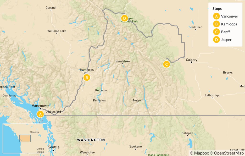 Map of Explore the Canadian Rockies by Train: Vancouver, Kamloops, Banff & Jasper – 7 Days