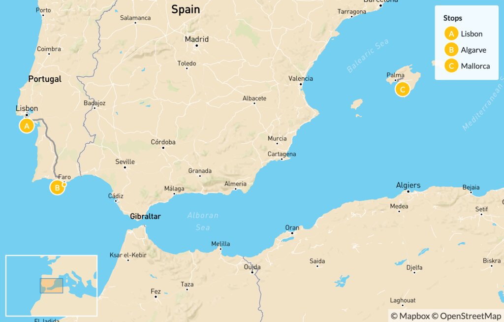 Eat your way around colorful Lisbon, admire the stunning natural coastline of the Algarve, and soak up the sunshine on the beaches of Mallorca with this relaxed 10-day coastal itinerary. As you hop between Portugal and Spain, balance slow beach days and relaxation with adventure and fun activities, such as sailing to the world-famous Benagil Cave, wine tasting at a traditional quinta estate, cycling through the lagoons of Ria Formosa, and paddleboarding on the bays of Mallorca.