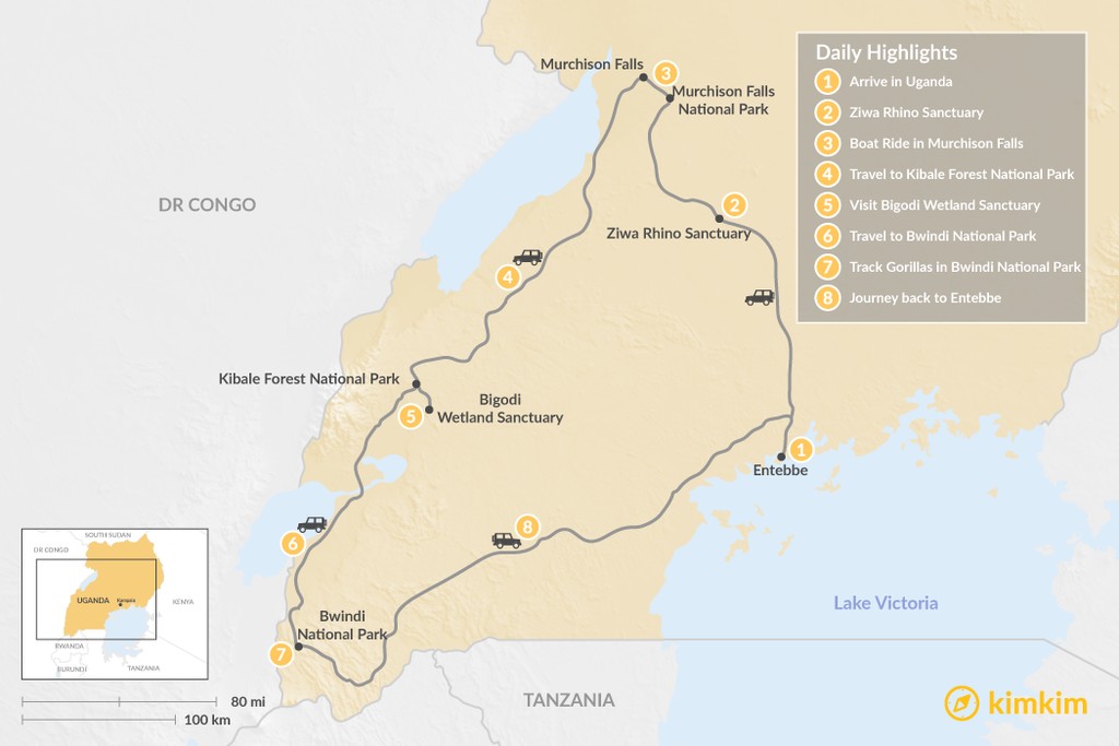 Map of Explore the Nature & Wildlife of Uganda – 8 Days