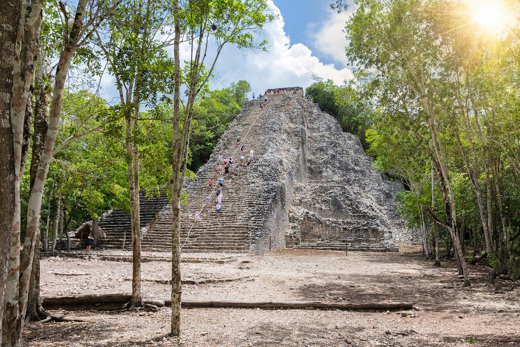 Cobá is famed for having the largest network of stone causeways, which are known as sacbés (white roads). Over 50 sacbés have been discovered at Cobá, each leading to the main pyramid Nohoch Mul, which at 248 feet (42 m), is the tallest of its kind in the Yucatán Peninsula. Climb 120 steep stone steps to the top of the pyramid for views over Cobá.