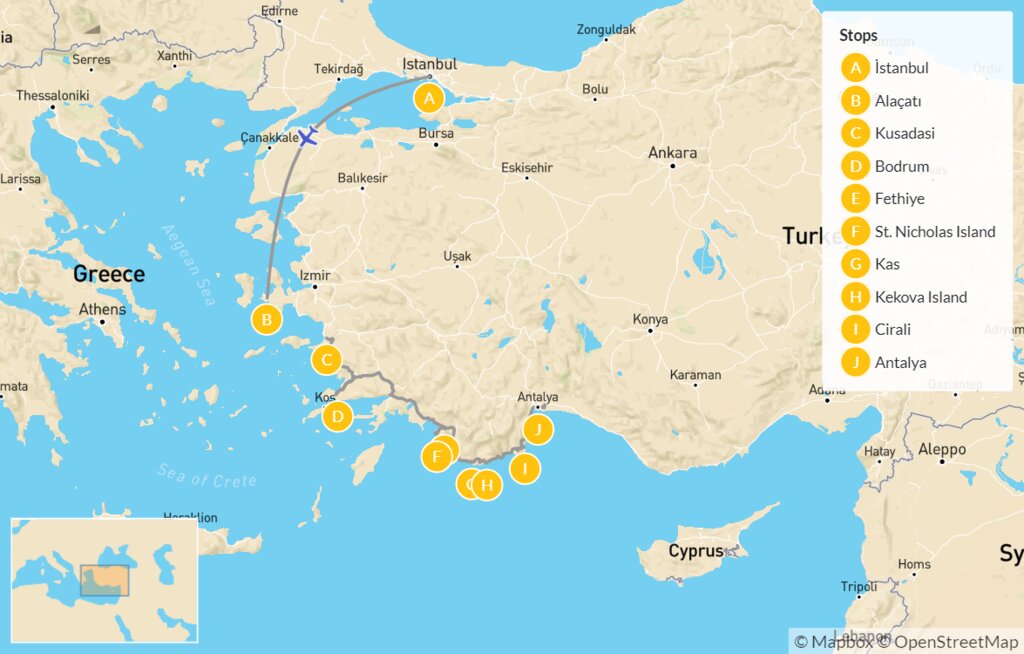 Map of Explore Turkey’s Turquoise Coast by Land & Water – 13 Days