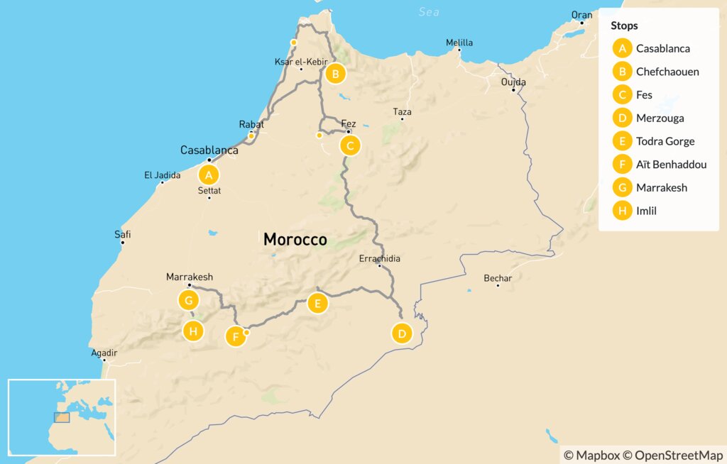 Map of Exploring Morocco’s Imperial Cities & Natural Landscapes – 13 Days