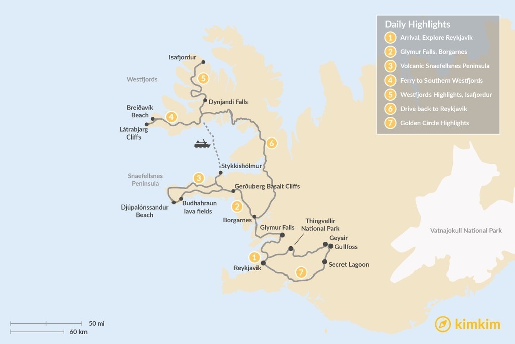 Map of Exploring the Snæfellsnes Peninsula, Westfjords & Golden Circle – 7 Days