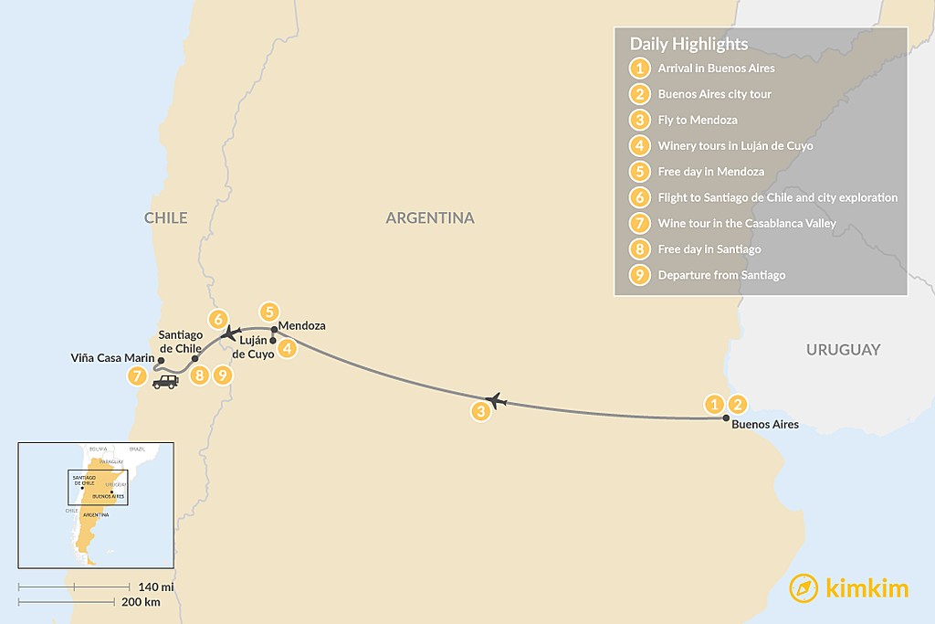Map of Exploring the Wine Regions of Argentina & Chile – 9 Days