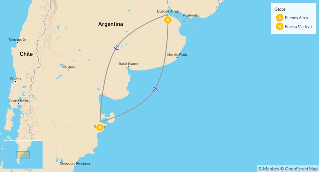 Map of Family Adventure in Buenos Aires & Patagonia’s Valdés Peninsula – 7 Days