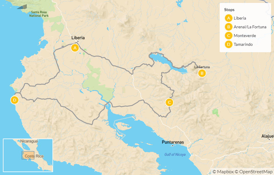 Map of Family Adventure in Costa Rica: Volcanoes, Cloud Forests & the Ocean – 10 Days