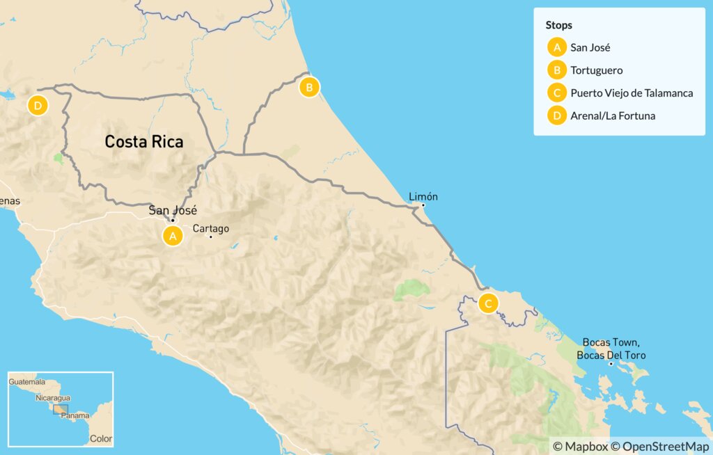 Map of Family Adventure in Costa Rica: Wetlands, Volcanoes & Caribbean Beaches – 9 Days