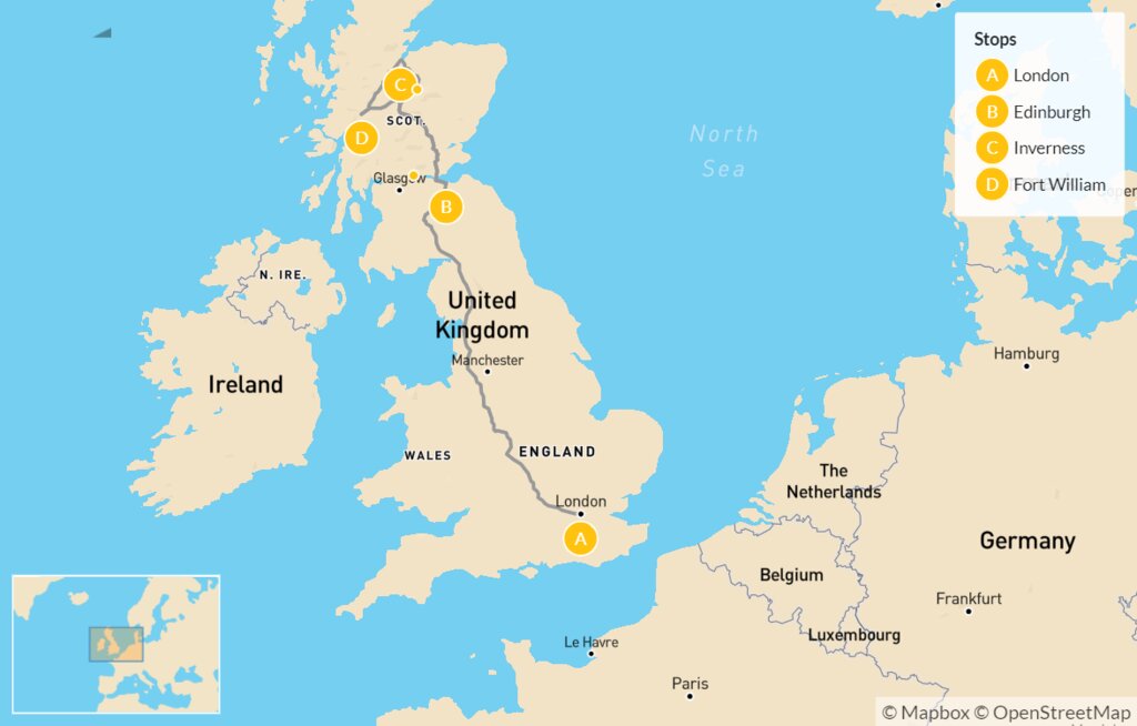 Map of Family Adventure in England & Scotland: London, Edinburgh & The Highlands – 8 Days