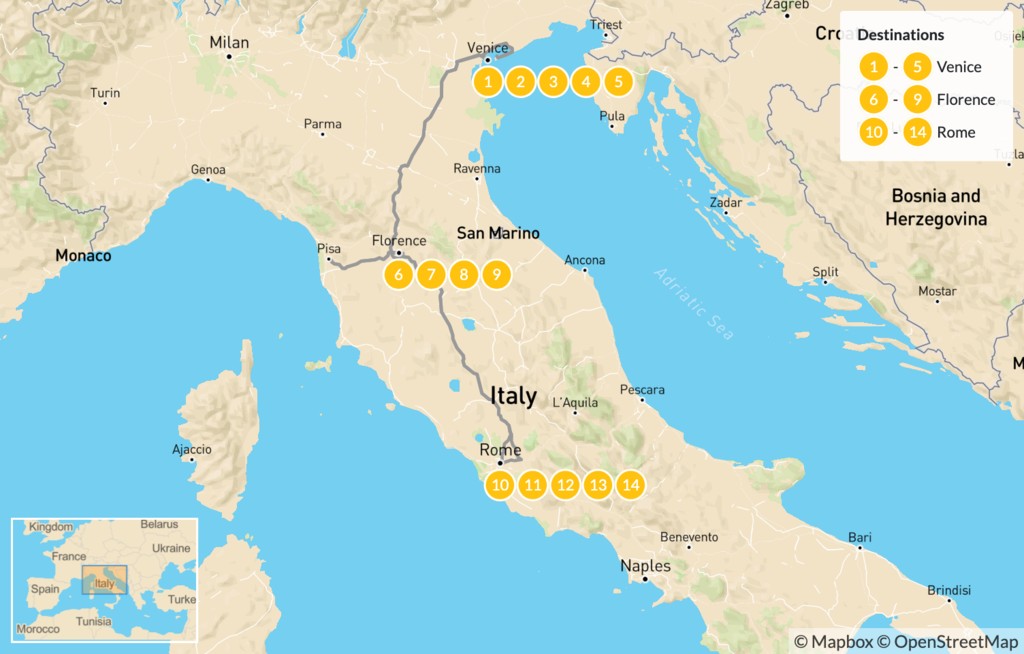 Map of Family Adventure in Italy: Venice, Florence, Rome – 15 Days