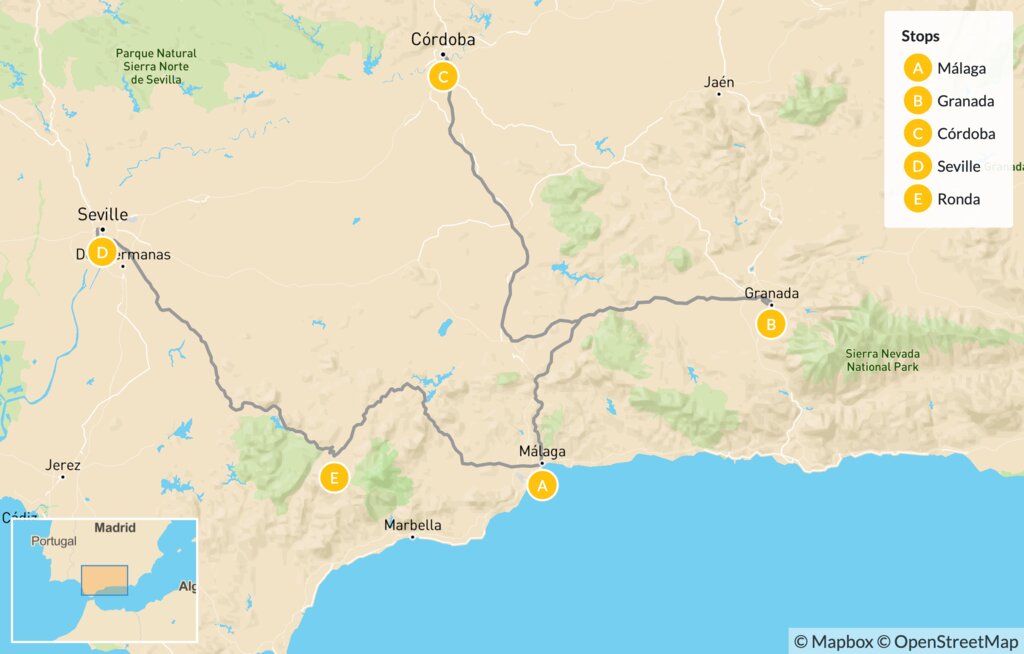 Map of Family Adventure in Southern Spain: Málaga, Granada, Seville & More – 10 Days