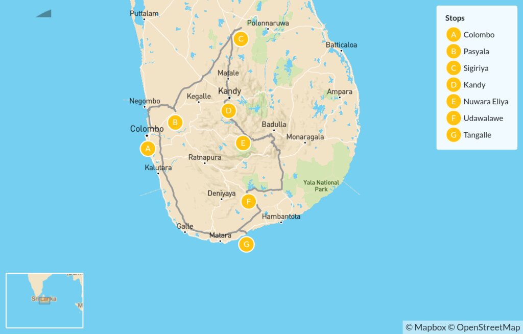 Map of Family Adventure in Sri Lanka: Pasyala to Tangalle – 14 Days