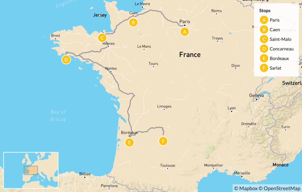 Map of Family Adventure in Western France: Paris, Caen, Saint-Malo & Bordeaux – 14 Days