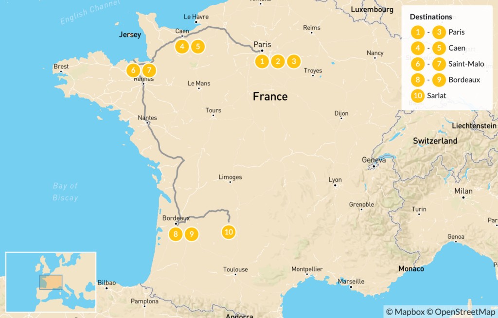 Map of Family Adventure in Western France: Paris, Caen, Saint-Malo, Bordeaux, & More – 11 Days