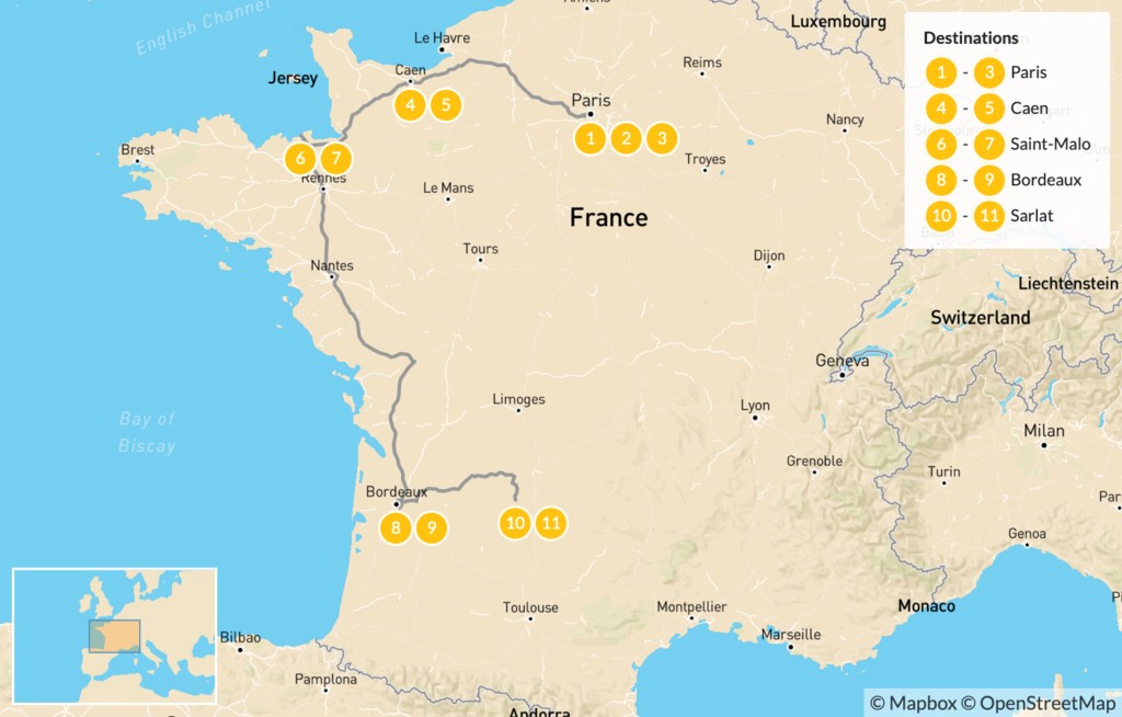 Map of Family Adventure in Western France: Paris, Caen, Saint-Malo, Bordeaux, & More – 12 Days
