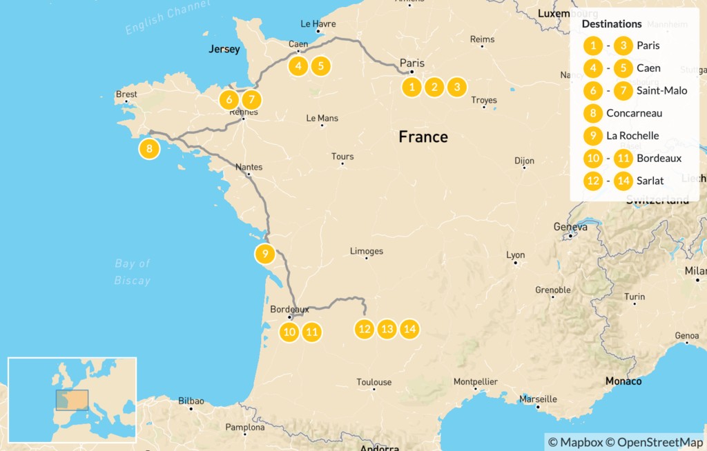Map of Family Adventure in Western France: Paris, Caen, Saint-Malo, Bordeaux, & More – 15 Days
