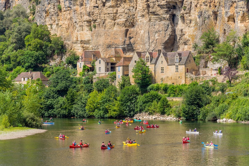 Head down to town for lunch, then spend the afternoon on the water on a self-guided canoe trip. Choose from a variety of routes, from 3 miles (5 km) to 16 miles (26 km) on either the Vézère, the Dordogne, or both. Opt for a relaxing paddle on quiet water or set your sights on some small rapids and exciting whitewater. Either way, the scenery alongside the river is spectacular: rolling hills, deep forest, pastureland and vineyards, and riverside cliffs. Take your time along the river, pausing to swim, picnic, sunbathe, or dip your toes in the water.