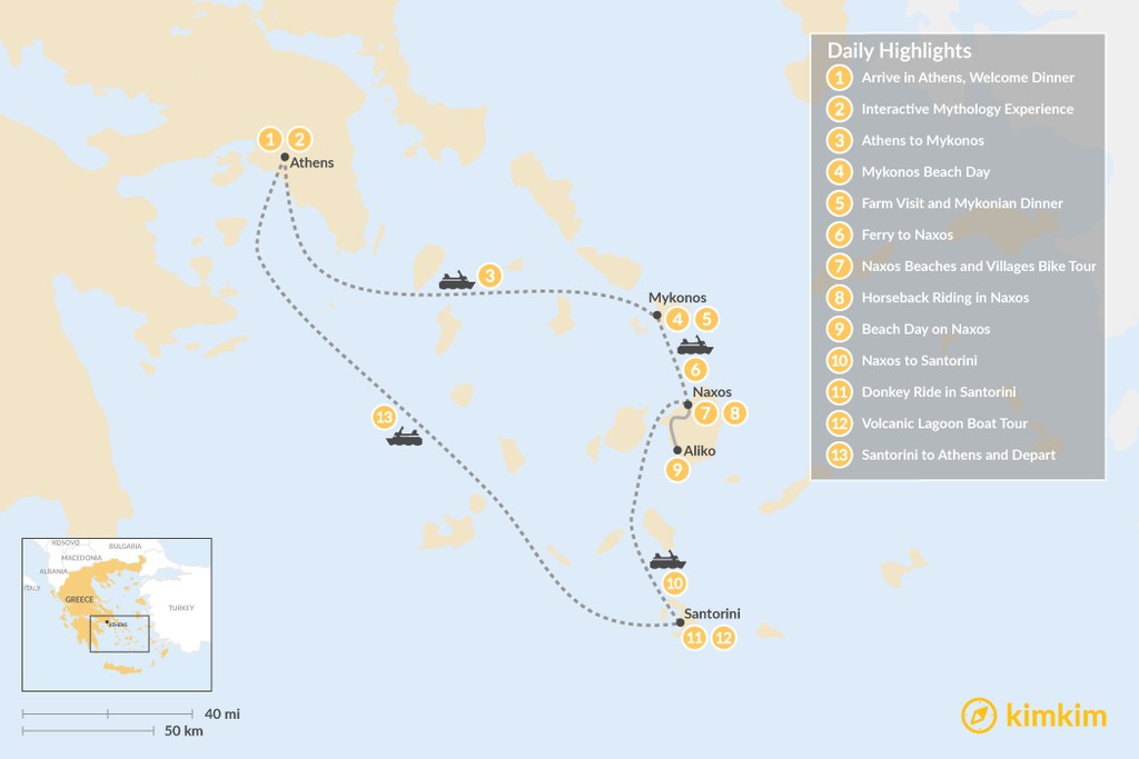 Map of Family Adventures in Athens and the Cyclades – 13 Days