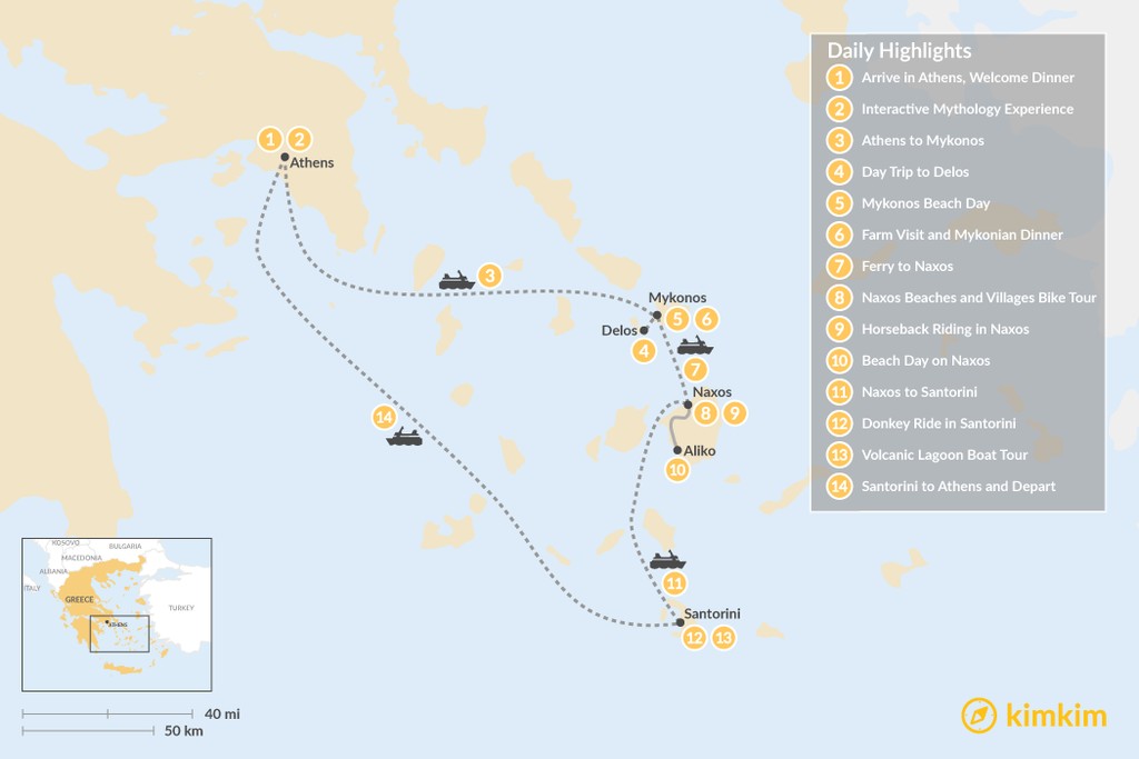 Map of Family Adventures in Athens and the Cyclades – 14 Days