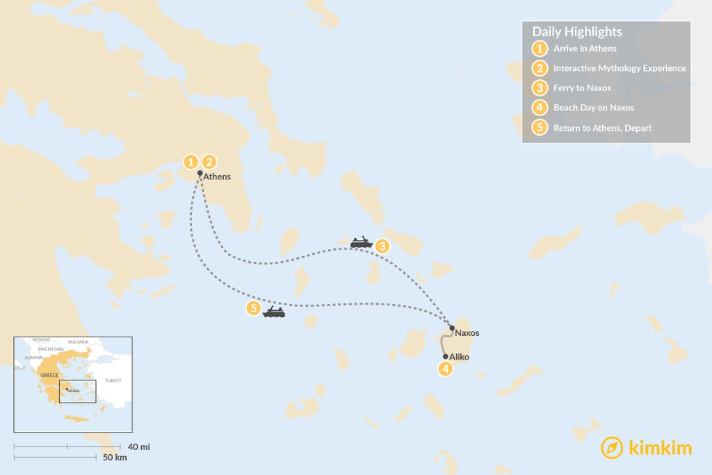 Map of Family Adventures in Athens and the Cyclades – 5 Days