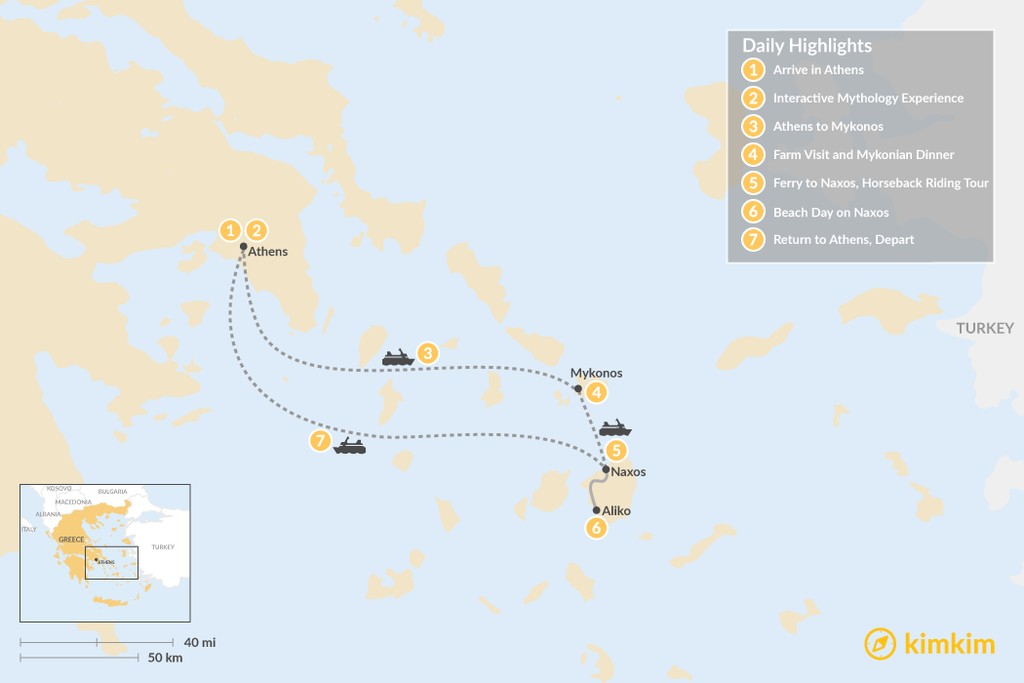 Map of Family Adventures in Athens and the Cyclades – 7 Days