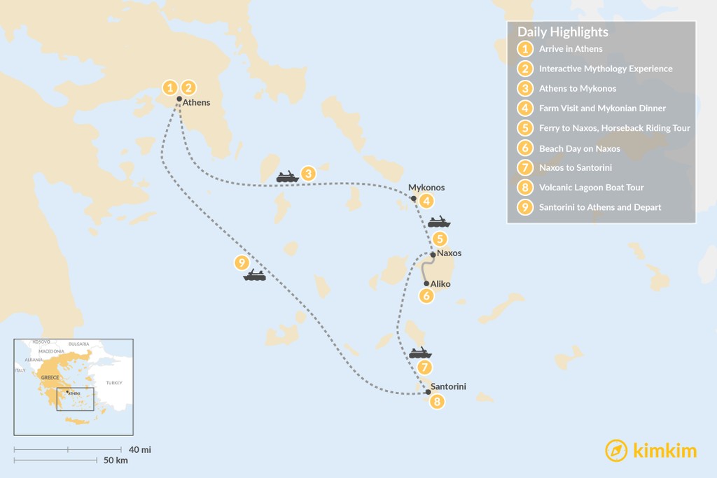 Map of Family Adventures in Athens and the Cyclades – 9 Days