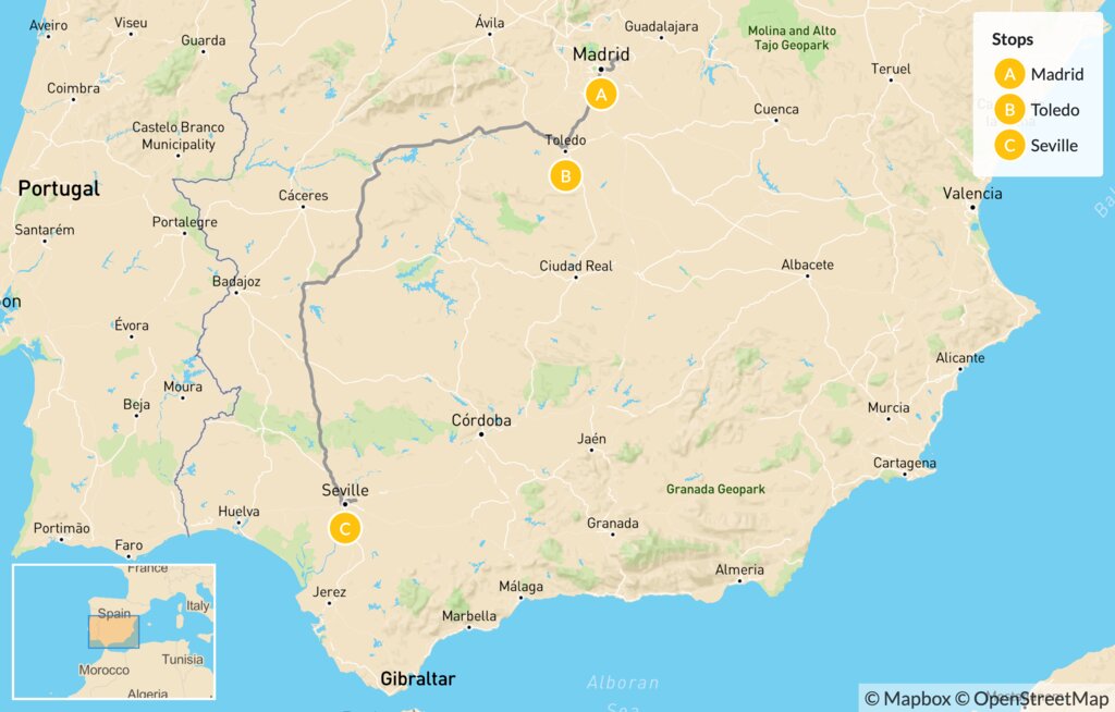 Map of Family Adventures in Spain: Madrid, Toledo & Seville – 8 Days