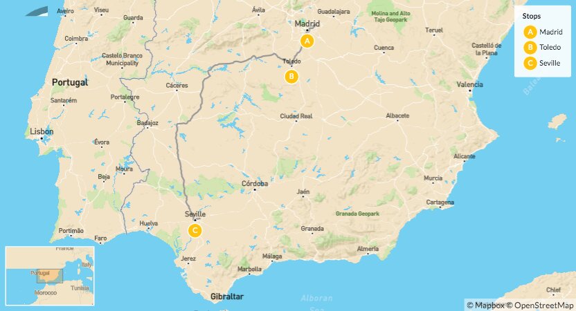 Map of Family Adventures in Spain: Madrid, Toledo & Seville – 9 Days