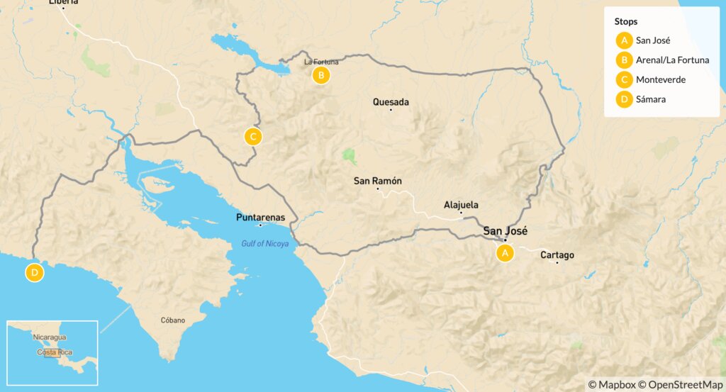 Map of Family Exploration of Costa Rica: Wildlife & Adventure in Arenal, Monteverde & Sámara – 14 Days