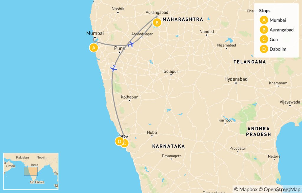 Map of Family Exploration of India: Mumbai, Aurangabad & Goa – 10 Days