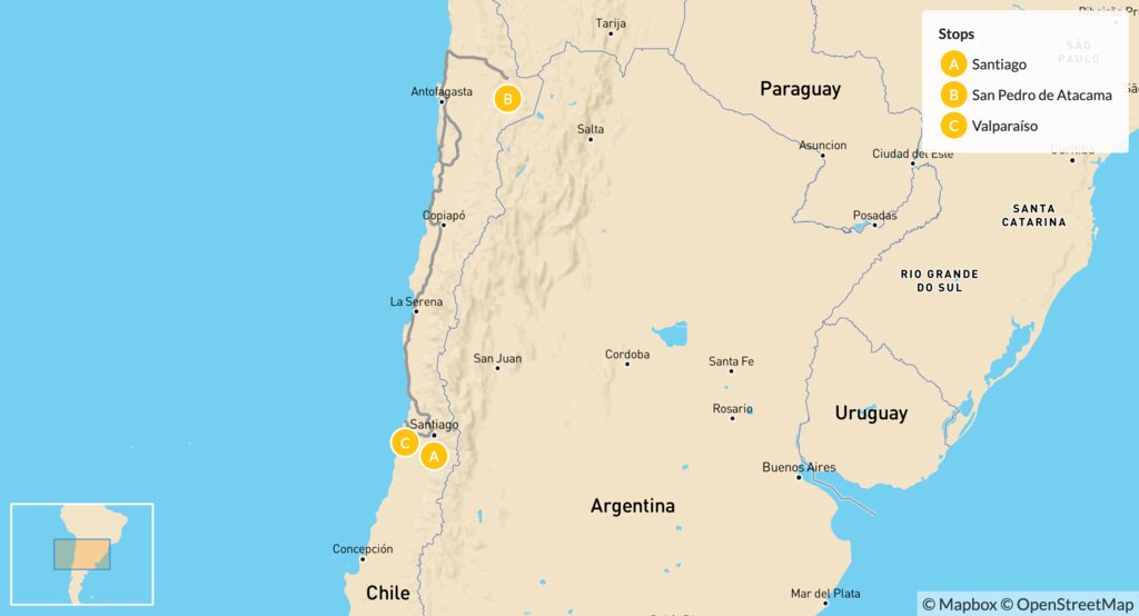 Map of Family-Friendly Chile Highlights: Santiago, Atacama Desert & Valparaíso – 10 Days