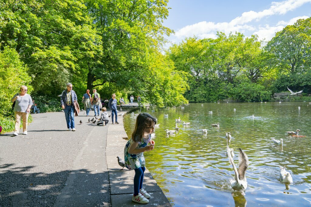 Start in the Medieval Quarter, where you’ll find St. Audeon’s Park, which sits next to an ancient church and the old medieval walls of Dublin, and St. Patrick’s Park, which is right next door to St Patrick’s Cathedral, founded in 1191, and the national cathedral of the Church of Ireland. Visit the old graveyard at St Kevin’s Park, part of the St. Kevin’s Church, then stroll through St Stephen’s Green, a Victorian park with beautiful flower beds, a lake, and resident swans that the kids will love.