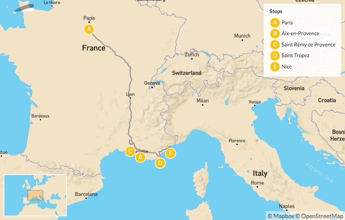 Map of Family Fun & Culture in France: Paris, Provence & the French Riviera – 14 Days