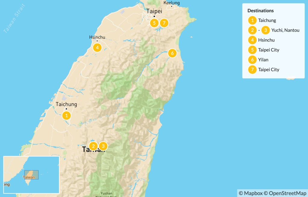Welcome to Taiwan! Your itinerary starts in Taipei, but you won’t linger here for long before you get on the road to Taichung. The country’s second most populous city is home to a multitude of museums and cultural sites and is also frequently used as the gateway to Taiwan’s interior mountains.