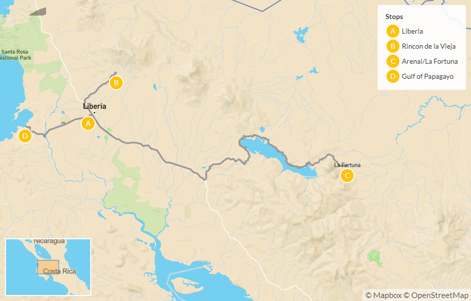 Map of Family Trip to Costa Rica’s Mountains, Volcanoes & the Gulf of Papagayo – 11 Days