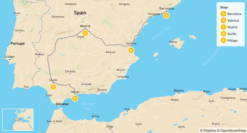 Map of Family Trip to Spain: Barcelona, Valencia, Madrid & Andalusia – 13 Days