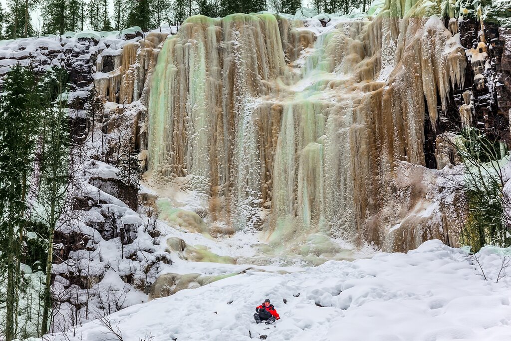 Today is a full-day tour to Korouoma Canyon, a protected nature reserve that becomes a frozen wonderland in winter, complete with ice waterfalls and snowy forests. As you walk through the ethereal landscape, sometimes the best way to tackle the trail is simply to slide down!